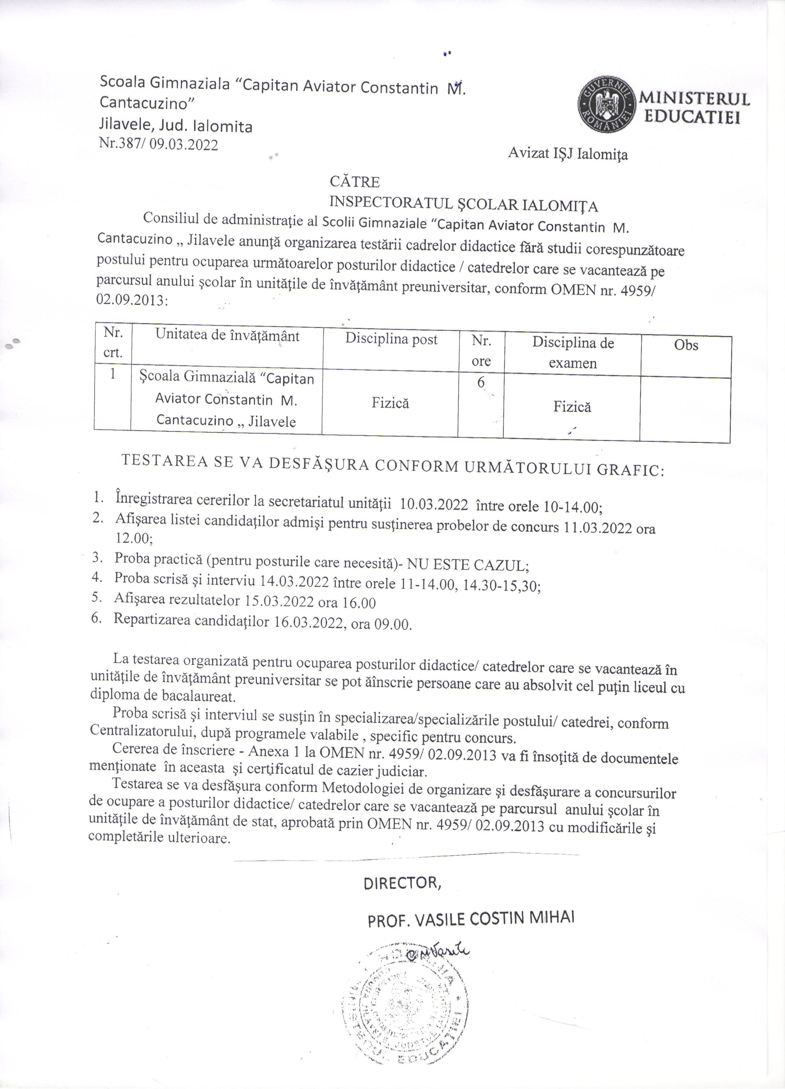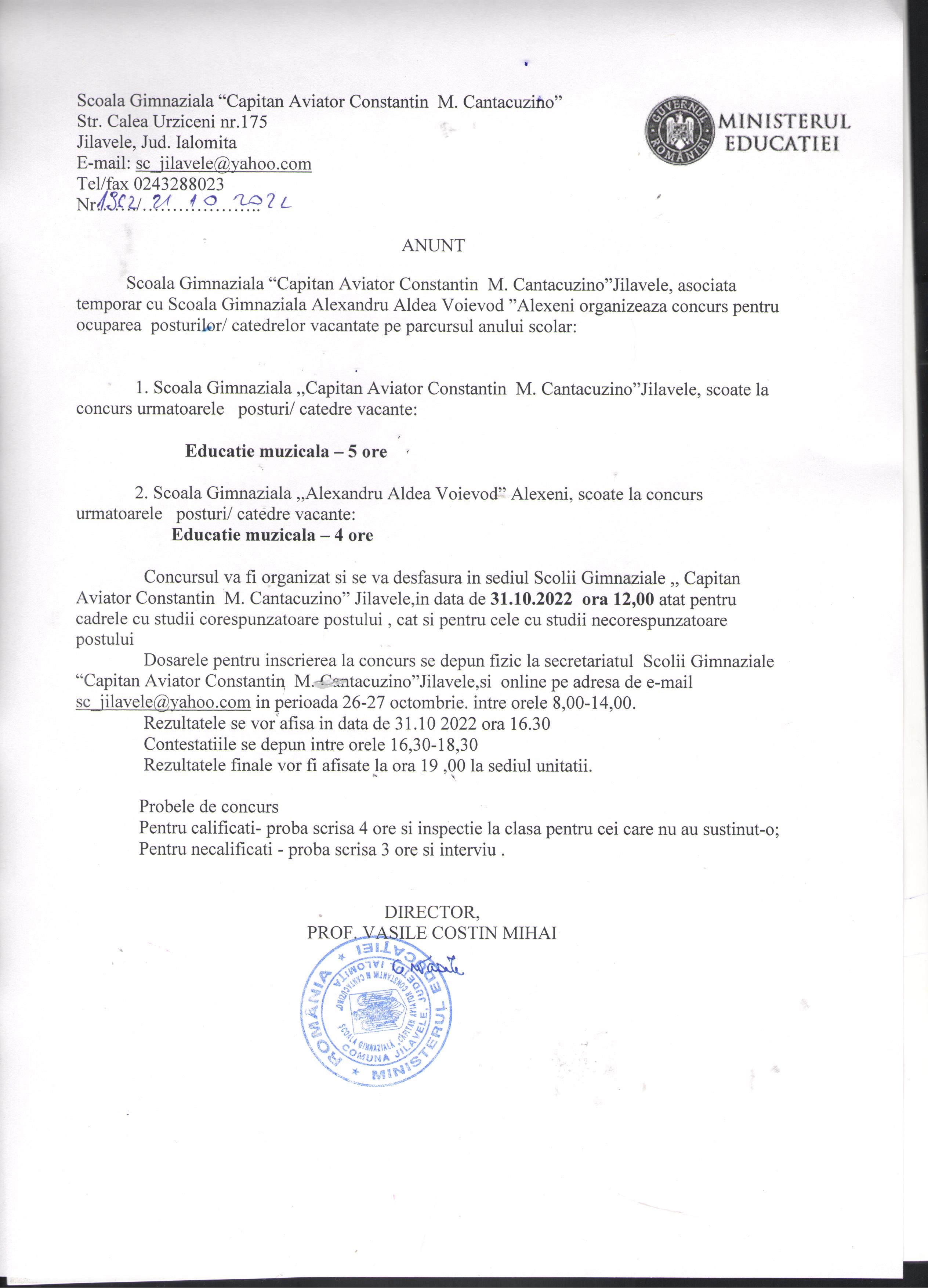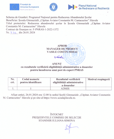 Situatia vaccinarii impotriva COVID-19 in randul angajatilor Scolii Gimnaziale ''Capitan Aviator Constantin M. Cantacuzino'' la 11.11.2021: